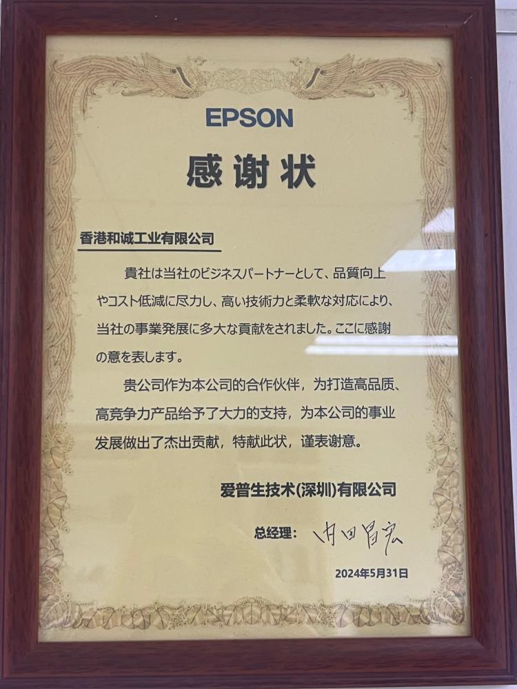 2024年:获得爱普生技术(深圳)有限公司优秀供应商奖;