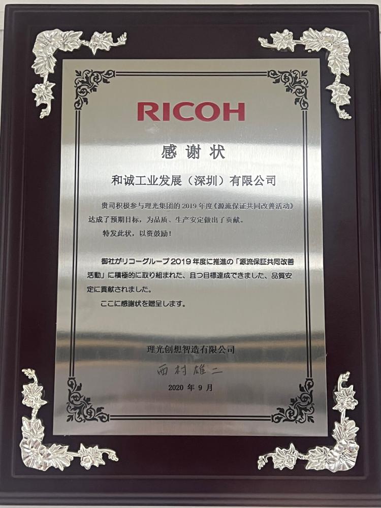 2013年:理光集团2013年源流保证活动达成目标,对提升部品质量有贡献获得表彰;
